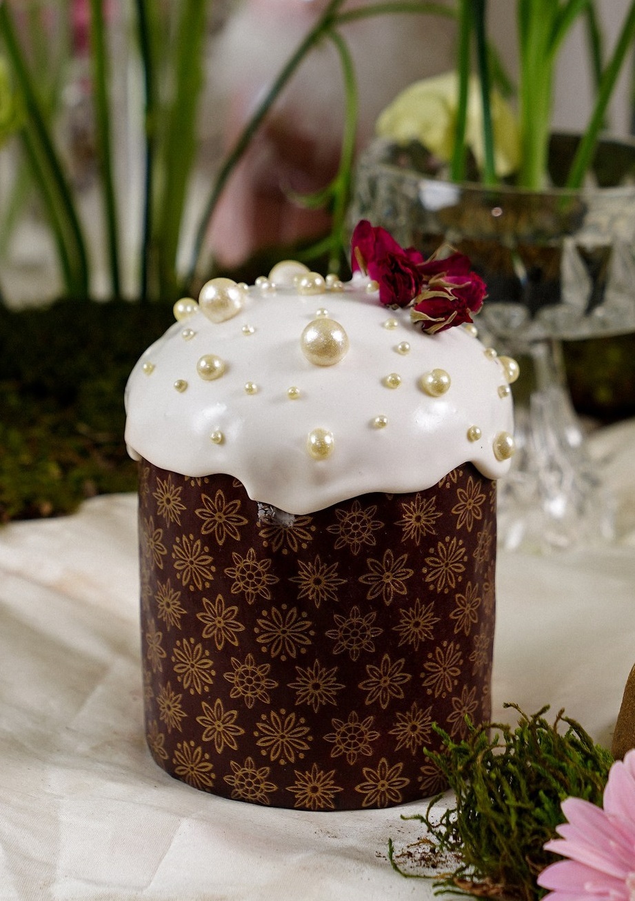 Кулич, приготовленный на основе рецепта итальянского рождественского Панеттоне. Воздушный, с золотистой корочкой, нежным мякишем и обилием цукатов и сухофруктов. Украшен ванильной помадкой и шоколадными драже.