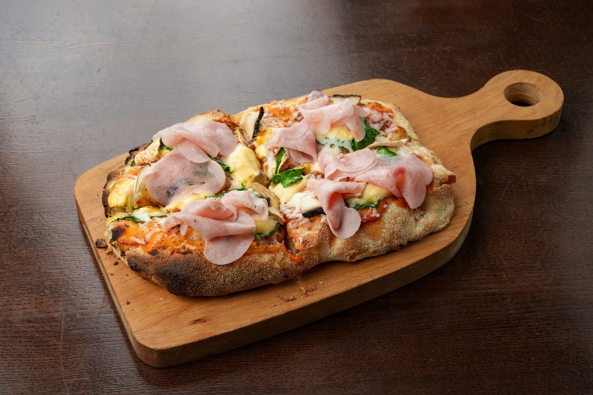 Римская пицца с ветчиной, грибами и шпинатом