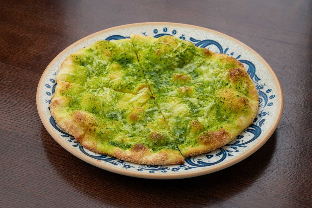 Традиционная итальянская пшеничная дрожжевая лепешка с соусом песто.