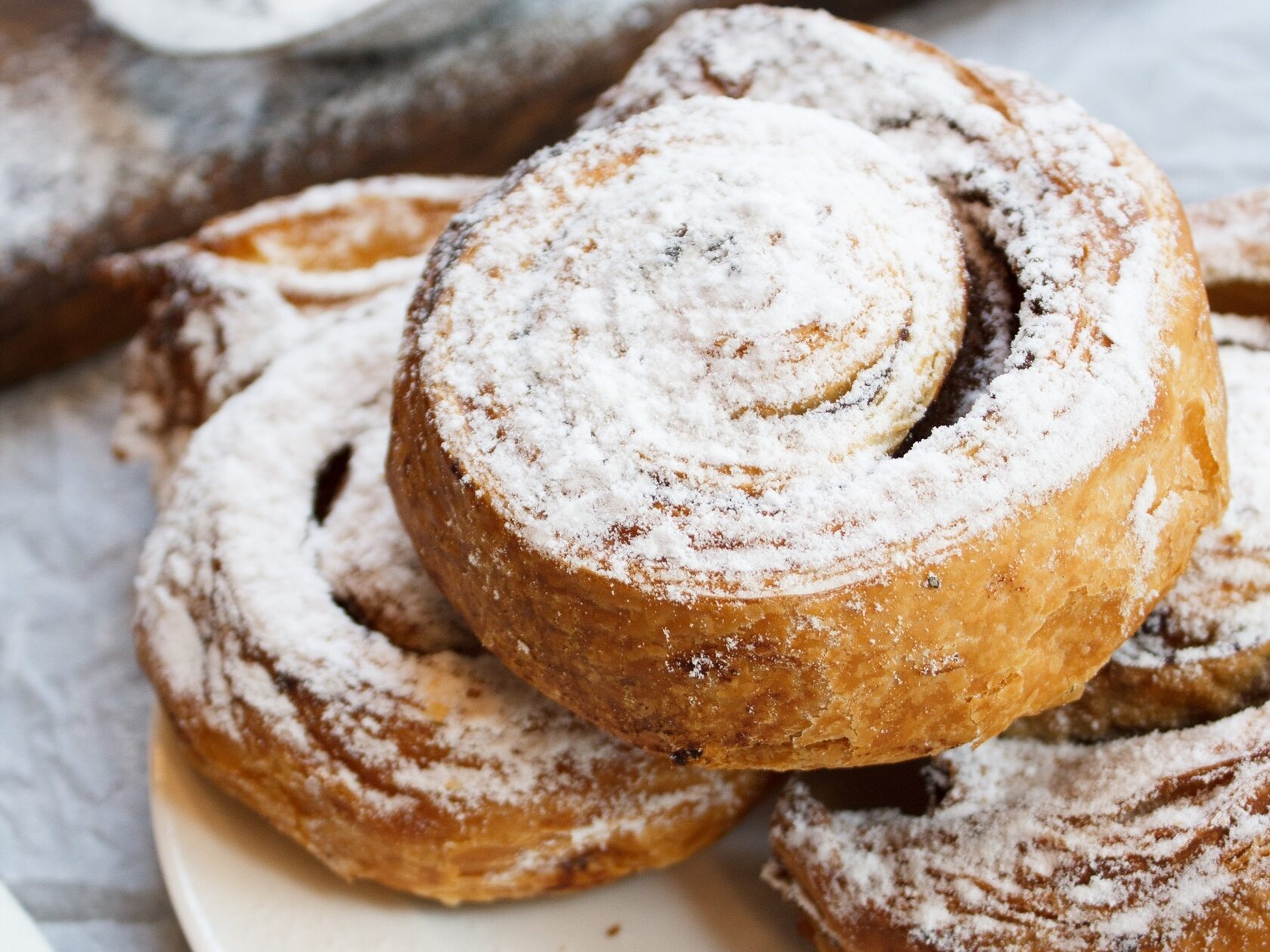 Датская слоеная выпечка, состоящая из воздушного слоеного теста и пряной корицы, сверху посыпана сахарной пудрой. Вес изделия 75 гр.